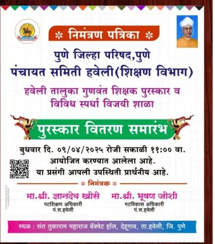 पुणे – तालुका स्तरावरील पंचायत समिती हवेली जिल्हा पुणे यांच्या वतीने दरवर्षी देण्यात येणाऱ्या पुरस्कारांची यादी जाहीर झाली आहे सन 2024- 2025 करिता हवेली तालुक्यातील अनेक गुणवंत आदर्श शिक्षकांची याकरिता निवड झालेली आहे त्याचप्रमाणे शिक्षकेतर कर्मचाऱ्यांना देखील त्यांच्या उत्कृष्ट कार्यालयीन कामकाजा करिता पुरस्काराने सन्मानित करण्यात येणार आहे. पुणे जिल्हा परिषदे अंतर्गत हवेली तालुका पंचायत समितीच्या वतीने दरवर्षी अशा पुरस्कारांची घोषणा करण्यात येते. शिक्षक वर्ग अतिरिक्त कार्यालयीन कर्मचारी श्रीमती पवार वर्षा हेमंत (गरुड) यांना यंदाचा कार्यालयीन गुणवंत कर्मचारी पुरस्कार जाहीर करण्यात आला आहे .या बाबत विविध स्तरावर त्यांचे अभिनंदन केले जात आहे ह्या पुरस्कारांचा वितरण सोहळा आज दिनांक 9 एप्रिल 2025 रोजी श्री संत तुकाराम महाराज बँकेट हॉल देहू गाव येथे संपन्न होणार आहे .